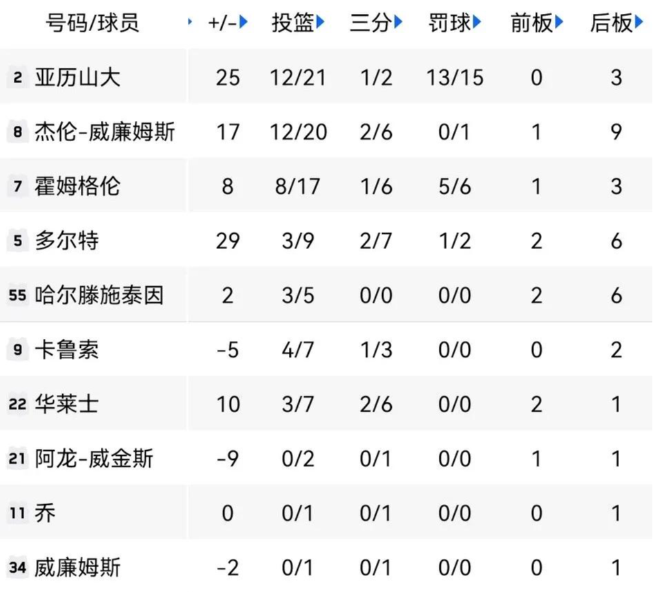 雷霆队:亚历山大38分3板8助3断,杰伦威廉姆斯26分10板5助,霍姆格伦22分4板2助,哈腾6分8板,多尔特9分8板4助2断,卡鲁索9分2断,华莱士8分4助。