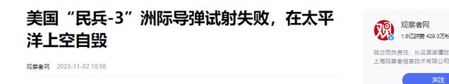 观察者网所发布《美国“民兵-3”洲际导弹试射失败,在太平洋上空自毁》