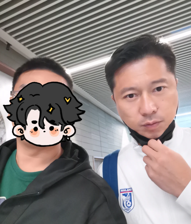 和网友的合影,没有美颜、滤镜的镜头下看上去脸像是一个“发面馒头”。