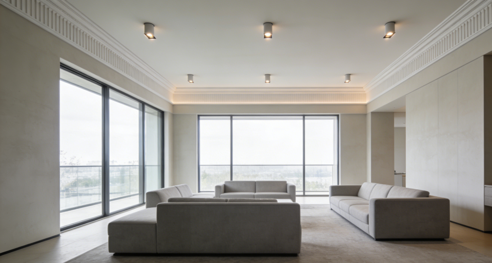 3. 复杂吊顶 → 简约显层高才是趋势厚重的多层回形吊顶会压低层高,显得压抑。现在流行局部吊顶或干脆不吊顶。用简单的石膏线或双眼皮线条装饰,搭配明装射灯或无主灯设计,空间更显宽敞明亮。