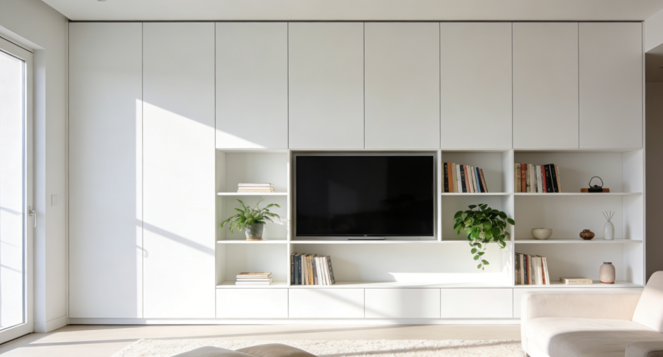 1. 浮夸电视墙 → 简约实用才是王道复杂的大理石、金属线条背景墙已显笨重。如今更流行整面收纳墙或简约留白。将电视嵌入通顶收纳柜,或直接使用纯色墙面,既能扩大视觉空间,也赋予了未来改造的更多可能性。