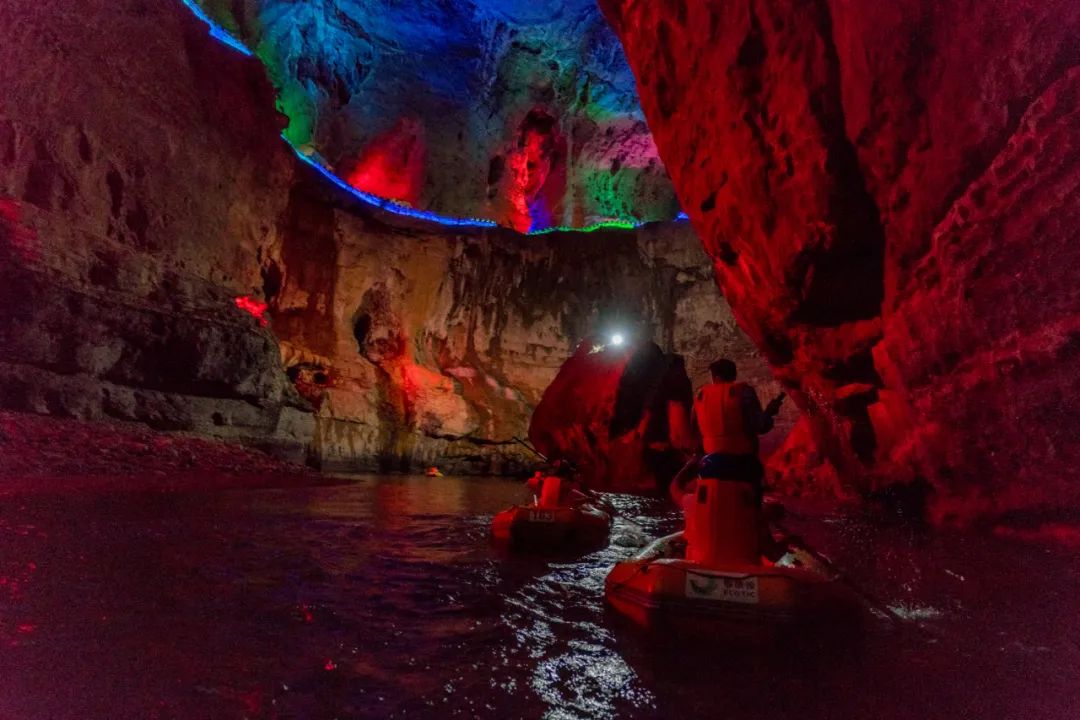 这个溶洞最大特色是可以漂流,全程会经历一明一暗一明,给人一种前所未有的新奇和清爽。