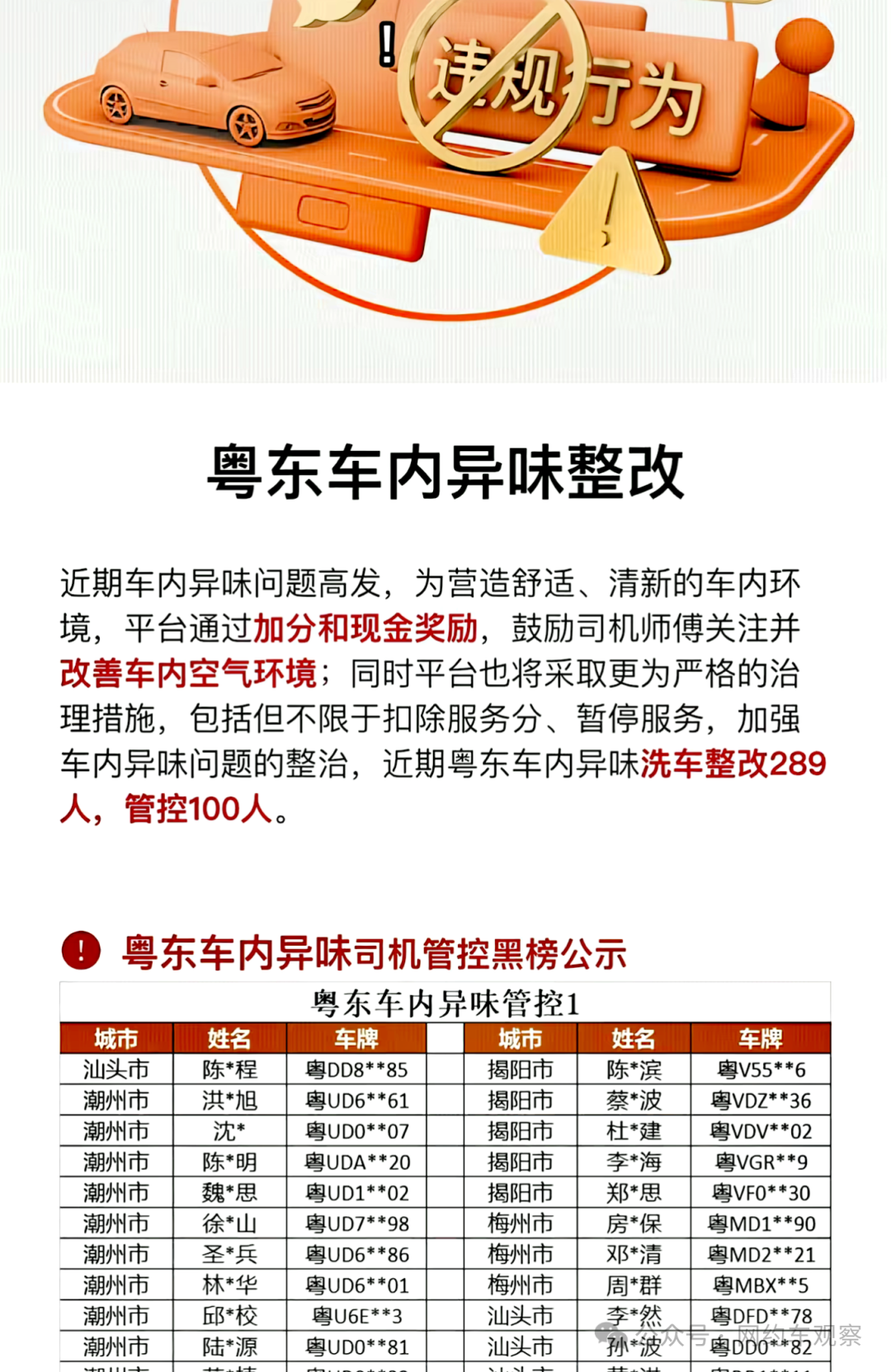 同时对车内异味也将采取更严格的治理措施并且公布了车内异味司机管控黑帮