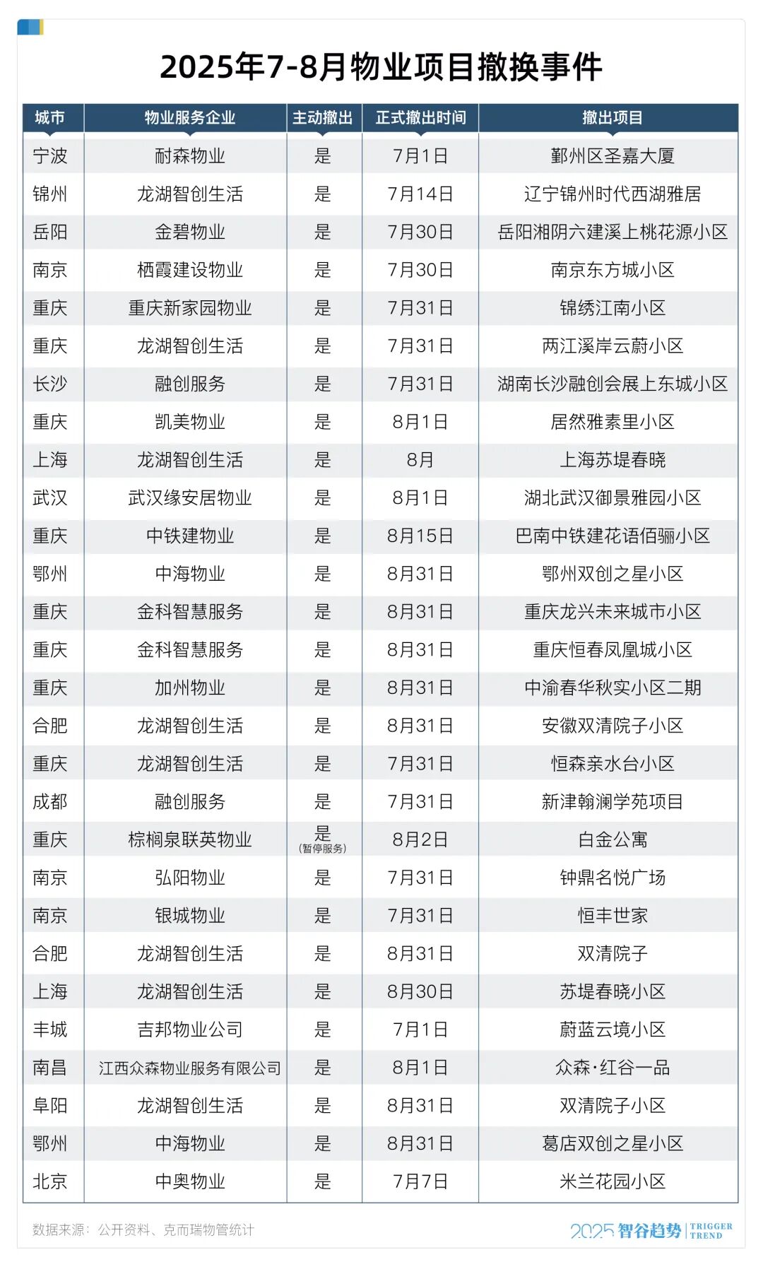 克尔瑞物管的数据更加吓人,仅今年7-8月,公开披露主动撤场的项目已近50个。其中,打“退堂鼓”的,不乏龙湖智创、金科服务、中海物业、融创服务这样的“优等生”。