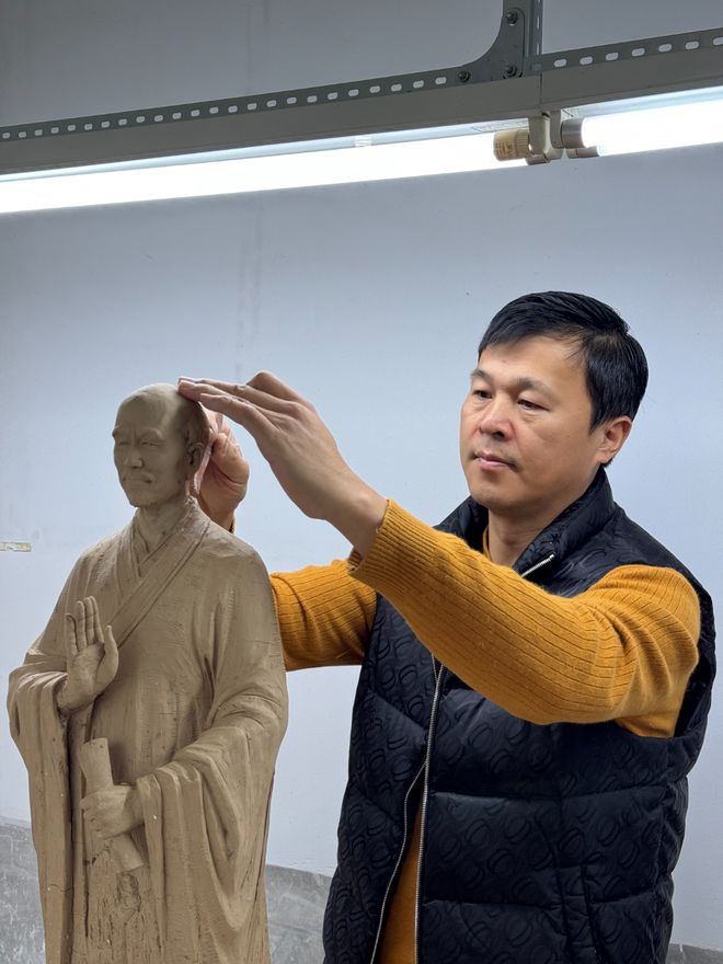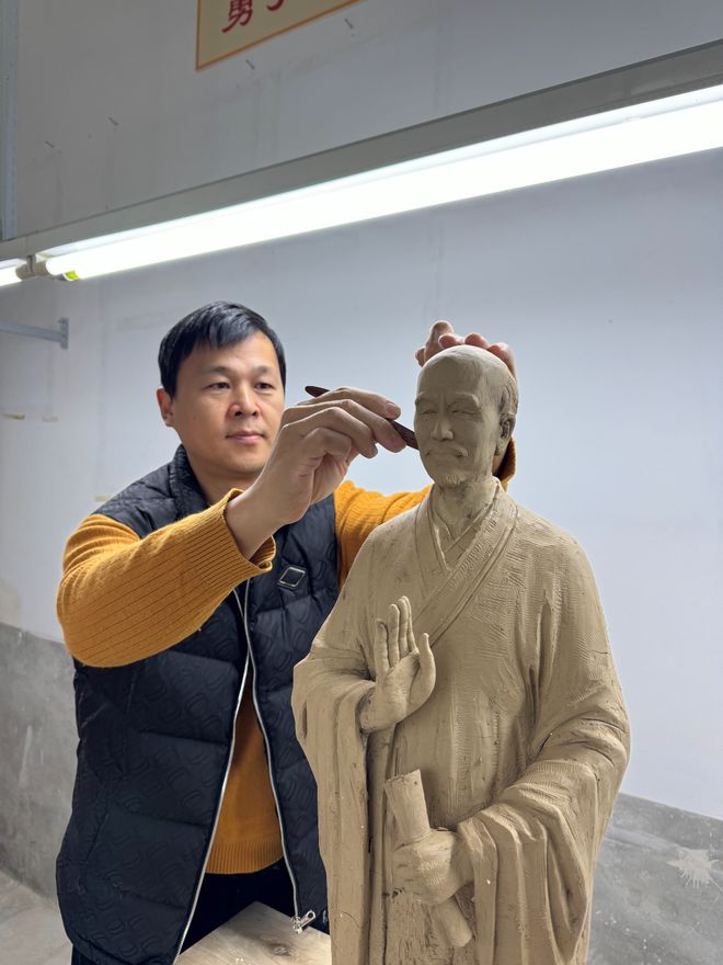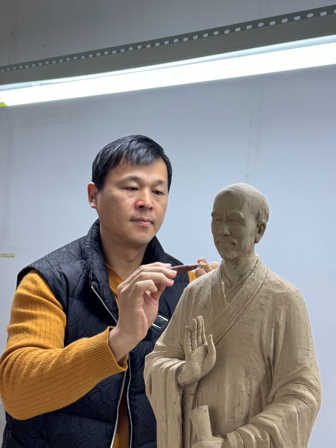 两位主创的默契合作,让作品兼具艺术价值与文化深度。林一豪的设计既延续了其佛教题材创作的深厚底蕴——其代表作《三十三观音》曾获多项国家级金奖并以41万元美元海外成交,又在《弘一法师》中融入对“悲欣交集”内涵的深刻解读,通过造像神态的精微把控,呈现法师对众生苦难的悲悯与得度往生的欣慰。魏金长则以“第十届中国泥塑技艺大赛一等奖”的过硬技艺,将设计理念精准落地,其细腻的雕刻手法让造像细节经得起近观细品,从耳垂的圆润弧度到僧袍的纹理转折,每一处都彰显着“加减并用”的匠心。
