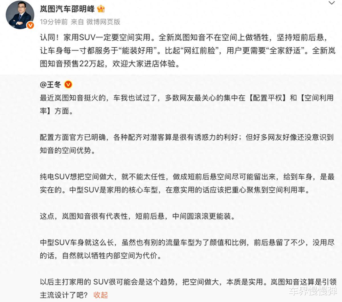 邵明峰进一步指出:家用SUV一定要空间实用。全新岚图知音不在空间上做牺牲,坚持短前后悬,让车身每一寸都服务于“能装好用”。此前岚图也旗帜鲜明地表示,跟风可以,但“只跟用户风,拒绝营销风”。