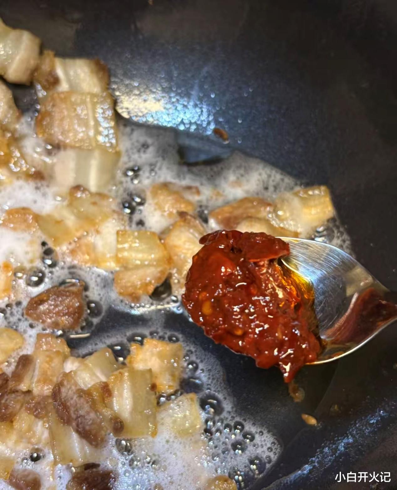 重头戏来了:热锅凉油,油要比平时炒菜多一丢丢,但别夸张到“炸”。油温五成热,下肉片,中火慢慢煸。耐心点,让肥肉里的油被逼出来,边缘微微卷起、呈“灯盏窝”状,才是最佳状态。这时候把肉推到锅边,空出的底油里放一勺郫县豆瓣酱(一定要剁细,不然大豆瓣容易焦),再捏碎两颗豆豉、撒点辣椒面,小火炒出红油。整个厨房瞬间像被点燃,酱香混着辣气直冲天灵盖,邻居如果来敲门,记得分他一口。