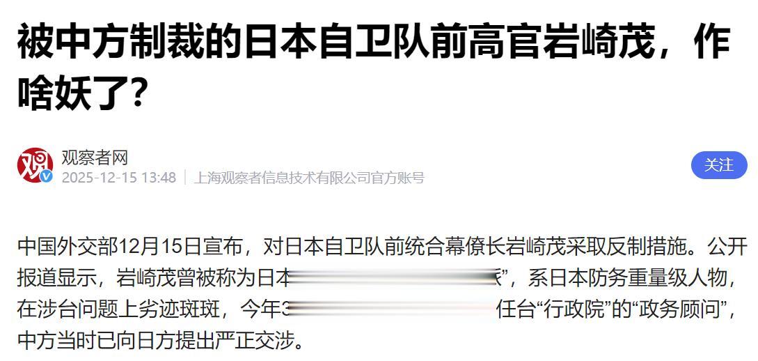 很多人还没意识到,这次对日本前自卫队统合幕僚长岩崎茂的制裁,已经不是简单外交摩擦的层面,而是中方对台海干预者开出的红牌信号,一记重拳掷地有声。