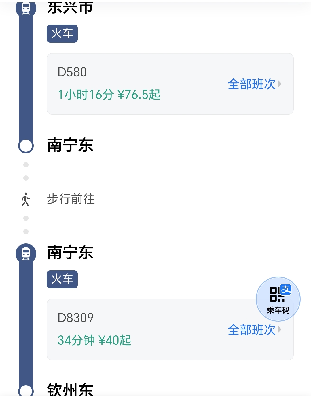 明明防城港到南宁的列车,要经过钦州境内,却不停靠,在广西那边绕来绕去地跑到南宁再折返回来,并不是什么合理的安排。目前东兴没有直达钦州、北海的动车组开行情况下的票价为40多元钱左右。以前从防城港到北海有直接列车,票费约为40多块钱,后来由于平陆运河修桥,这条线路就停运了,现在要到达北海只能选择在南宁站中转,价格一下子飙升到120元以上。