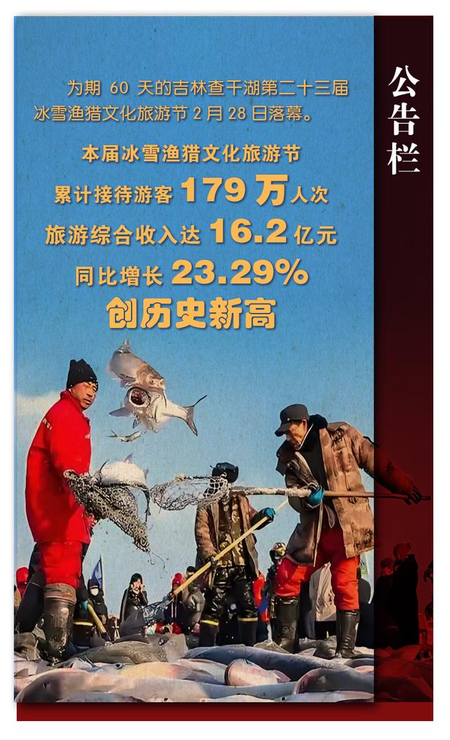 为期60天的吉林查干湖第二十三届冰雪渔猎文化旅游节2月28日落幕。本届冰雪渔猎文化旅游节累计接待游客179万人次,旅游综合收入达16.2亿元,同比增长23.29%,创历史新高。