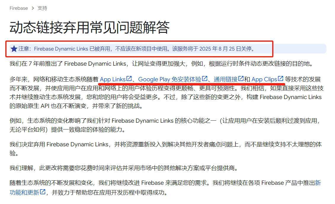 Firebase动态链接关闭已成定局!谷歌官方已明确宣布,Firebase Dynamic Links于2025年8月25日停止服务,此前Firebase动态链接已有一段时间无法应用于新项目了,官网相关页面已经404。这也意味着,从8月25日起,所有仍在运行的Firebase动态链接 (FDL) 将彻底失效。