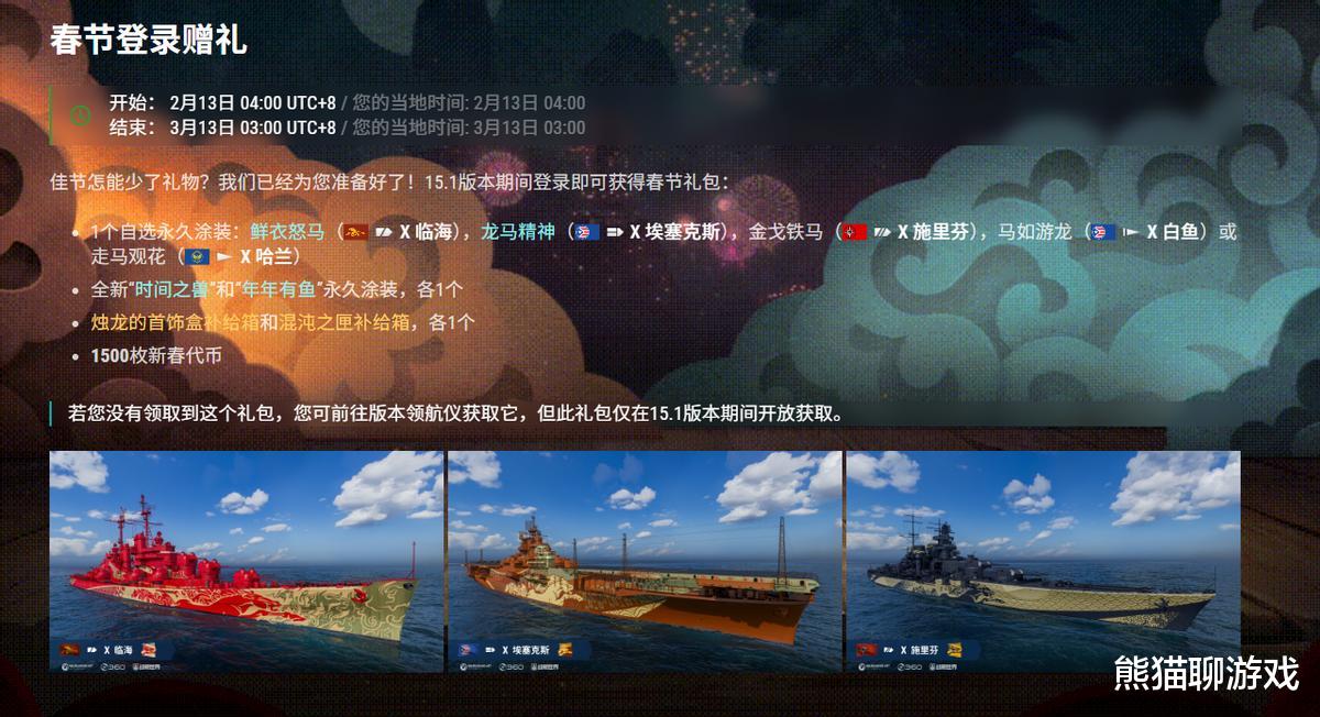 15.1版本的春节活动福利满满,除了能抽到太恒,还有超多战舰福利和玩法等待解锁。在2月17日迎来大年初一后,登录就能白嫖包括自选涂装、春节补给箱和1500春节代币在内的奖励。