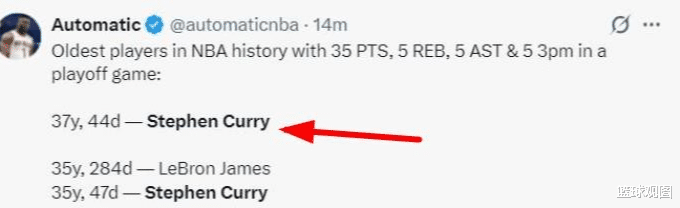 凭借本场比赛出色发挥库里创造了多项NBA历史纪录,首先他季后赛生涯总得分来到4053分,超越马刺名宿、NBA传奇球星托尼帕克,成为NBA历史上季后赛得分最多的控球后卫!此外库里还以37岁43天的年龄成为了NBA历史上最年长至少得到35分5篮板5助攻,外加5三分球的球员!这份数据其实远远不能体现本场比赛的超神表现!