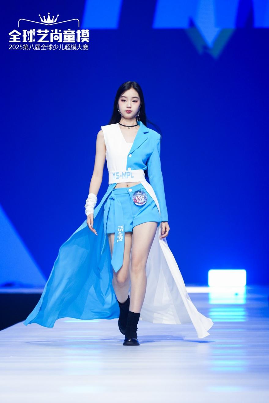 澄澈的蓝色如同夏日晴空,搭配简约白边勾勒线条,衬得少女身姿愈发挺拔,蓝色身影穿梭在聚光灯下,一登场便让全场眼前一亮。