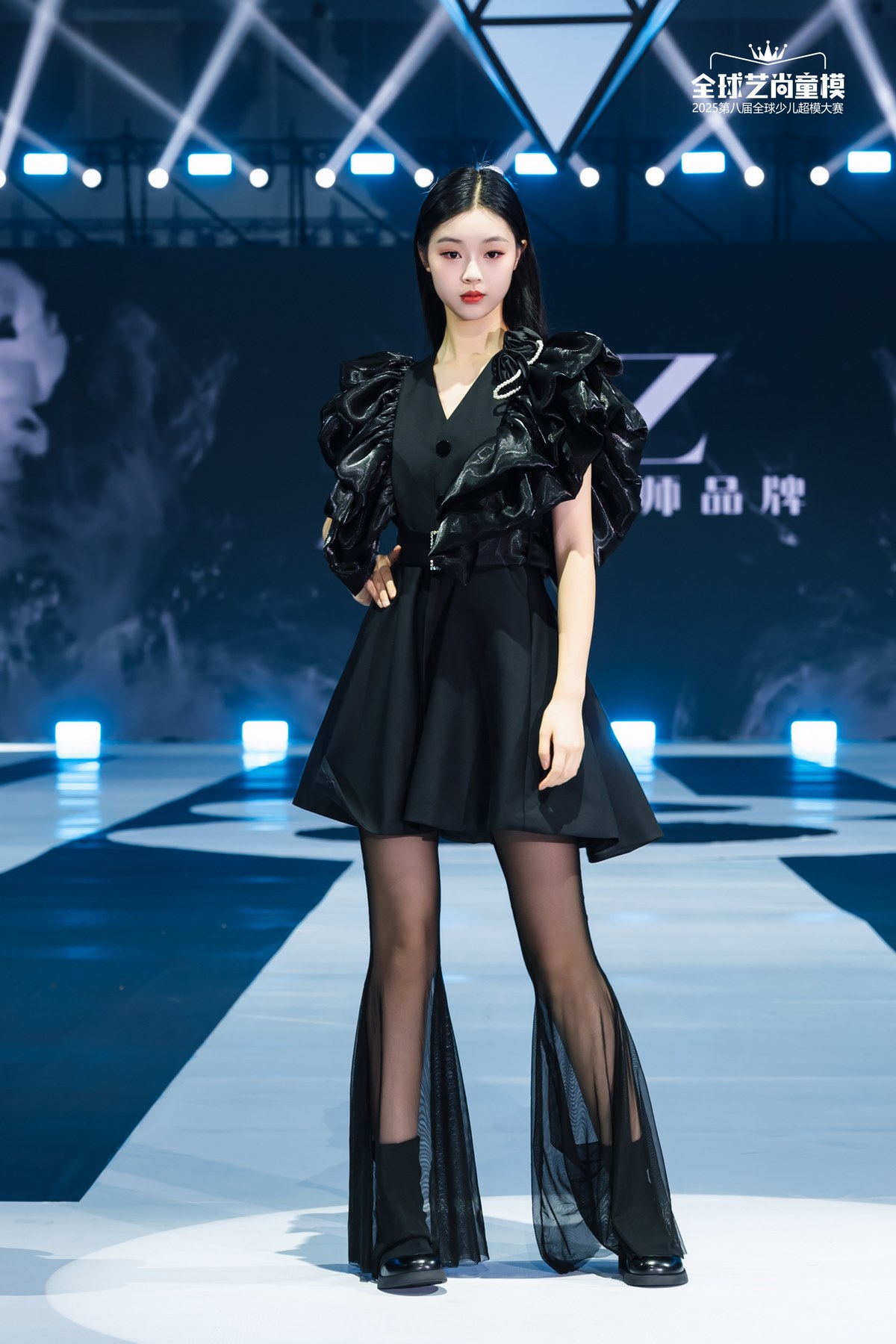 YZ品牌秀的登场,让暗黑系优雅美学在沈语桐的身上鲜活绽放!品牌服饰虽以黑色为底色,却在肩部蓬松装饰等细节处藏满巧思。沈语桐踩着节拍穿梭秀道,既演绎出品牌对造型与质感的极致追求,又用自信赋予服装神秘与灵动,让这身作品成为舞台上的焦点。