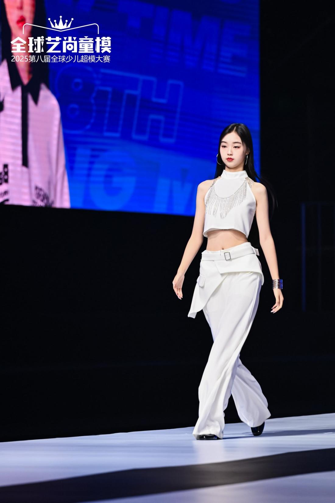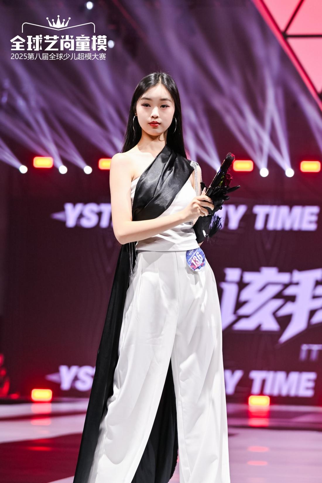 当“魔法压力破晓”的创意撞上自由DIY,第一套比赛服装便有了灵动模样!基础白色单肩套装被赋予巧思,一侧垂落的黑色饰边如同挥洒的水墨丝带,既打破了纯色套装的简洁,又透着少女特有的优雅与灵动。沈语桐穿着这套满是创意的服装登场,每一步都像在演绎 “时尚韵律” 的曼妙与洒脱,瞬间让舞台充满魅力与艺术感。