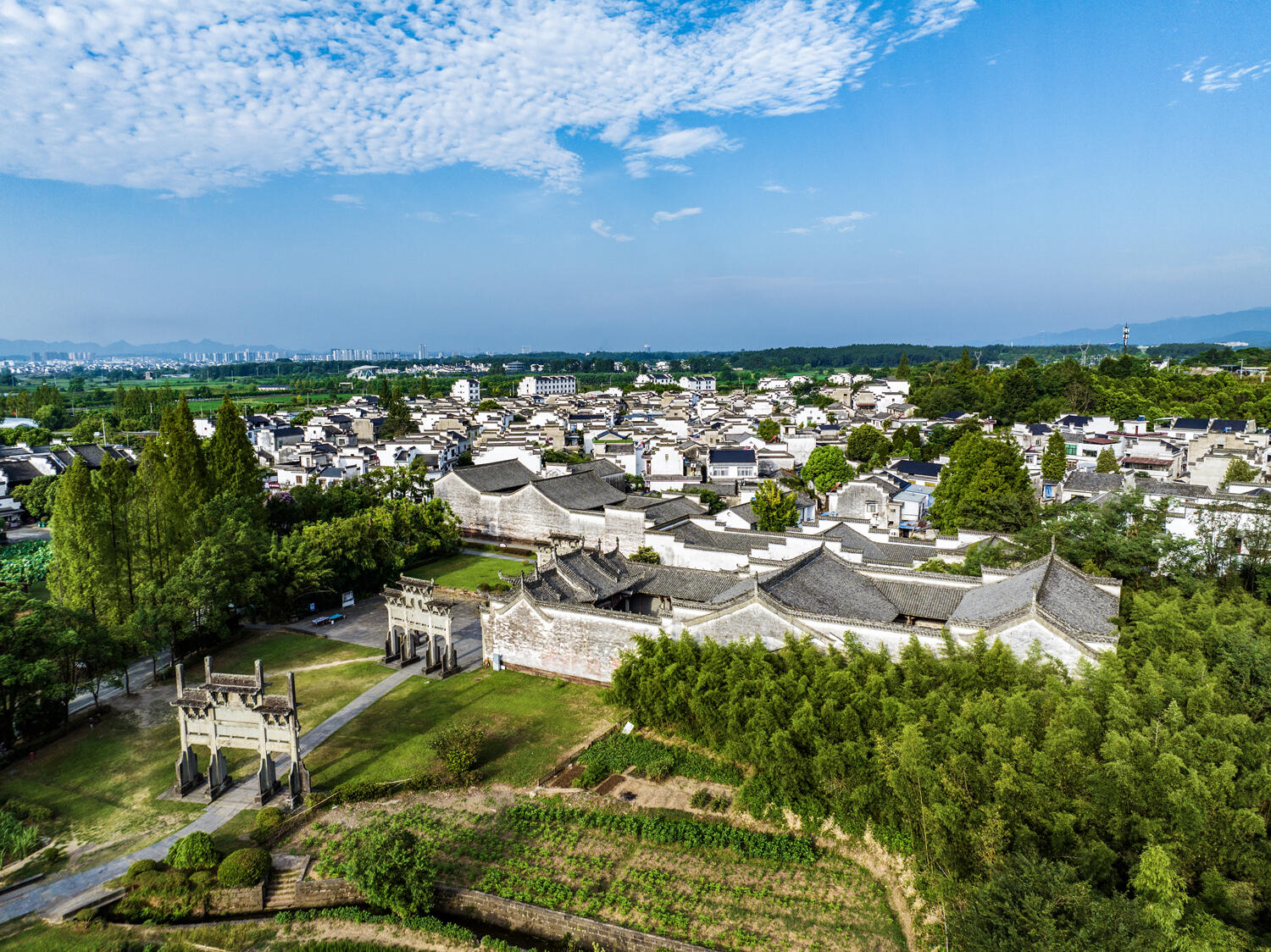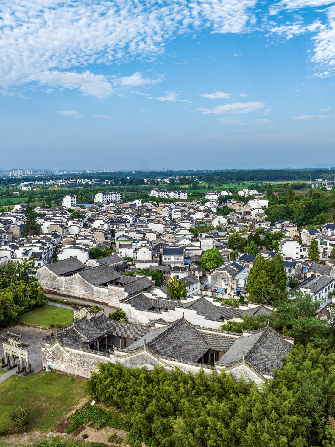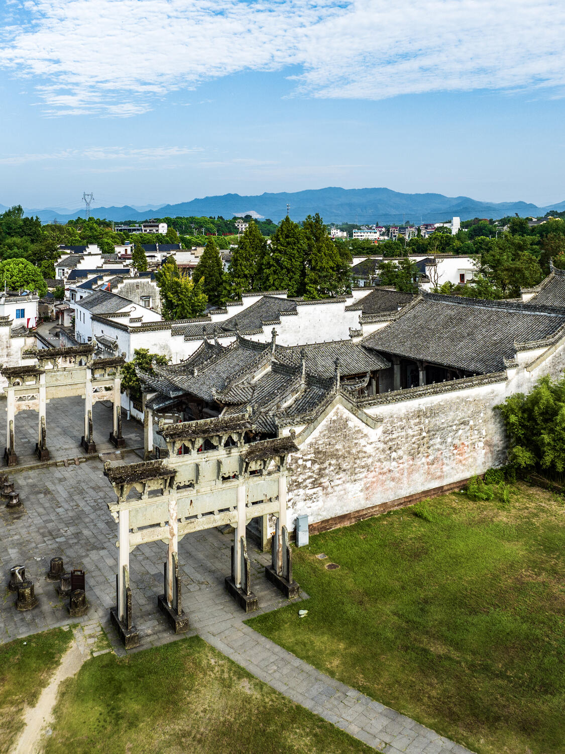 整个村落的布局暗藏玄机。两条主干道平行延伸,像两根琴弦,小巷则是交错的琴弦,把一座座宅子串联起来。站在高处俯瞰,白墙黑瓦的建筑群顺着地势起伏,高大的马头墙时而重叠,时而错落,像是谁用毛笔在宣纸上随意挥洒的墨痕。老人们说,这是按"枕山、环水、面屏"的风水理念规划的,龙山是靠,丰乐河是脉,连村口的七座牌坊,都暗合着北斗七星的方位。