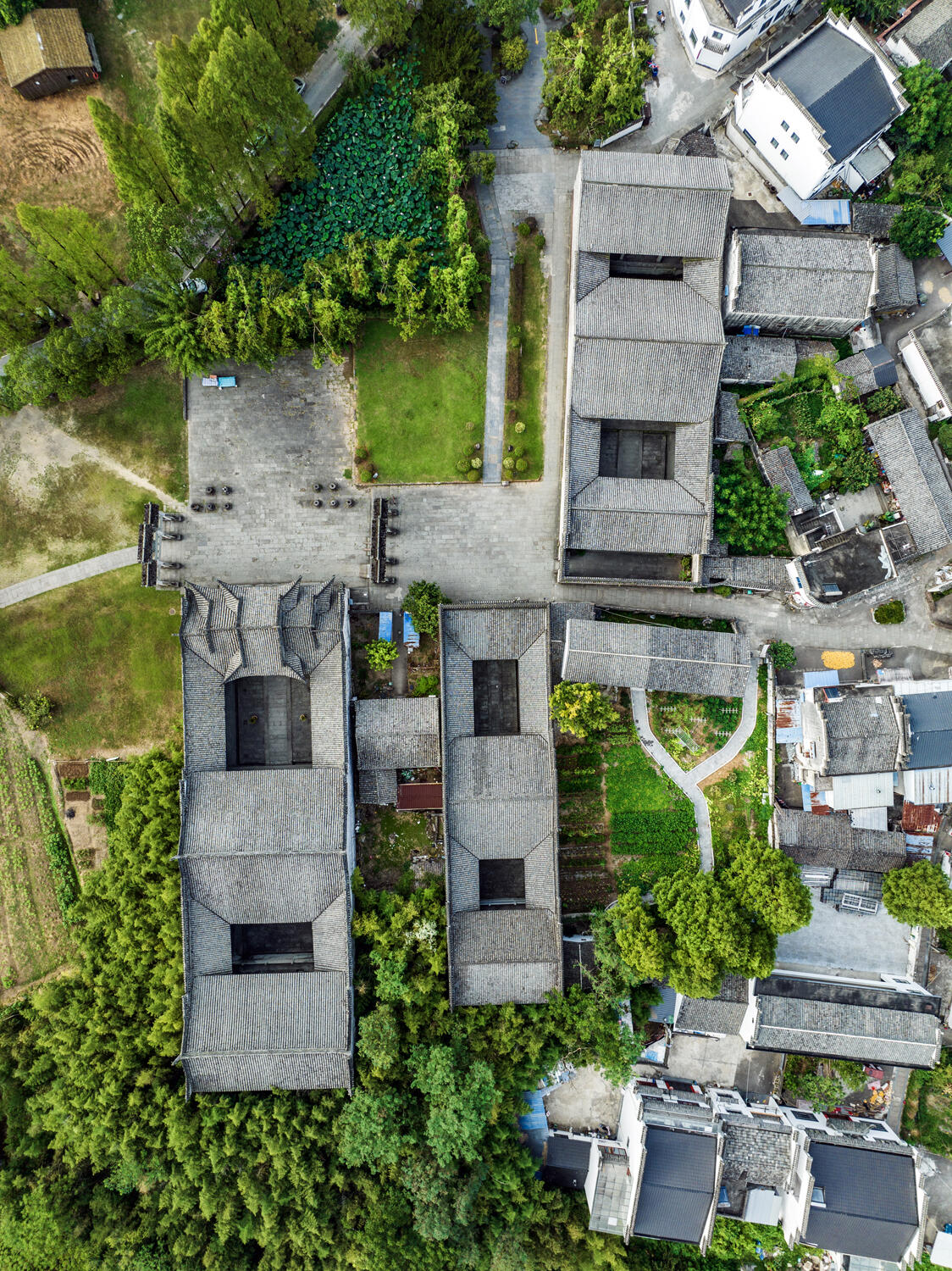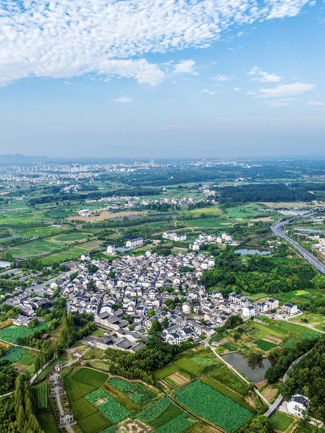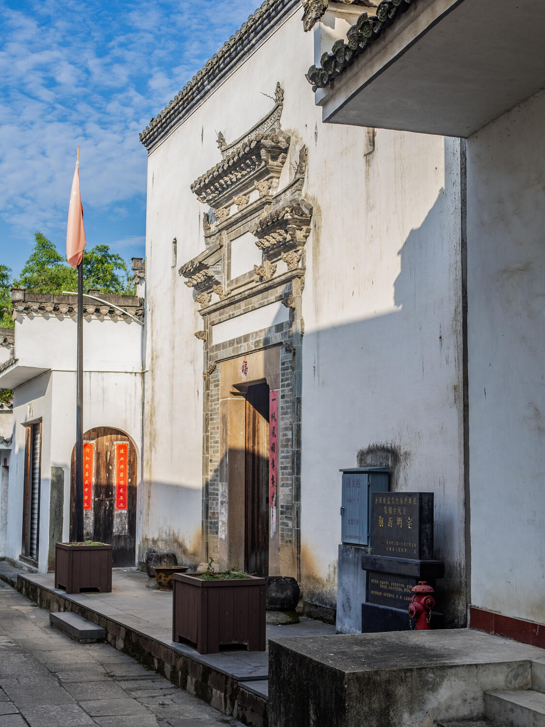 整个村落的布局暗藏玄机。两条主干道平行延伸,像两根琴弦,小巷则是交错的琴弦,把一座座宅子串联起来。站在高处俯瞰,白墙黑瓦的建筑群顺着地势起伏,高大的马头墙时而重叠,时而错落,像是谁用毛笔在宣纸上随意挥洒的墨痕。老人们说,这是按"枕山、环水、面屏"的风水理念规划的,龙山是靠,丰乐河是脉,连村口的七座牌坊,都暗合着北斗七星的方位。