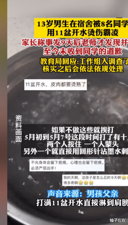 而事情的严重程度达到了令人发指的地步,当时在宿舍里,8名同学用11盆开水直接将他烫伤。这背后的霸凌行为令人震惊,更令人愤慨的是,孩子受伤后,事情竟然被隐瞒了整整9天,直到老师才发现并告知家长。