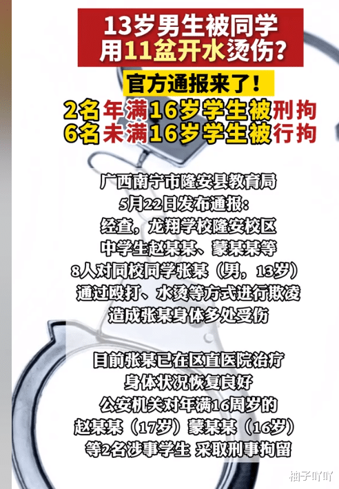 经过警方的调查,已有2名年满16周岁的涉事学生被刑事拘留,其余6名涉事学生被行政拘留。
