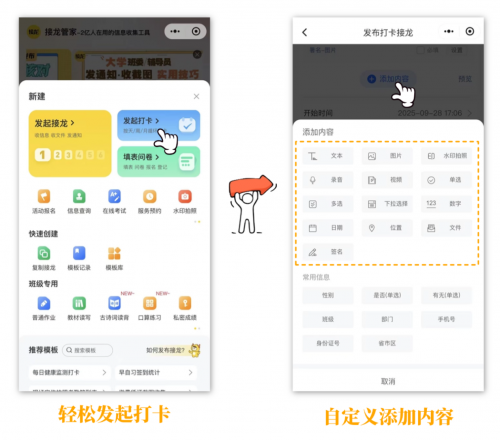 针对长期活动或周期性工作,可发布“打卡接龙”,还可自定义添加照片、视频、文字等打卡收集项,满足不同场景下的需求;