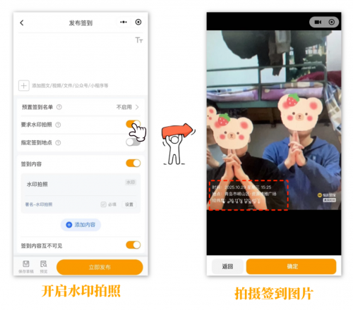 还可开启“水印拍照”,签到时照片自动添加时间、地点水印,拍照提交即可锁定现场信息,从根源避免代签、虚报。