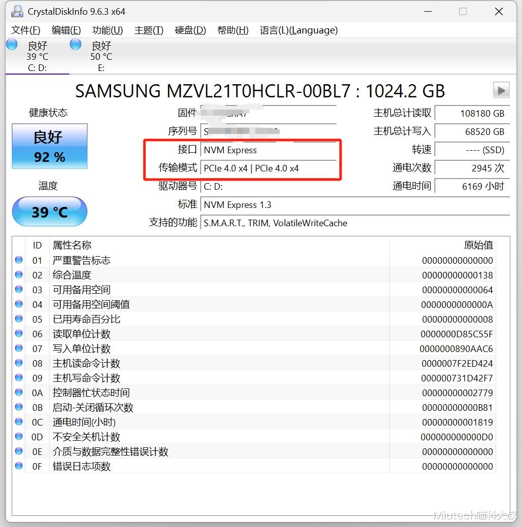 无论是笔记本还是电脑,只要是Windows系统,均可使用第三方免费工具CrystalDiskInfo进行查看,检测当前硬盘接口协议是否为“NVMe”,且传输模式是否为PCIE4.0。