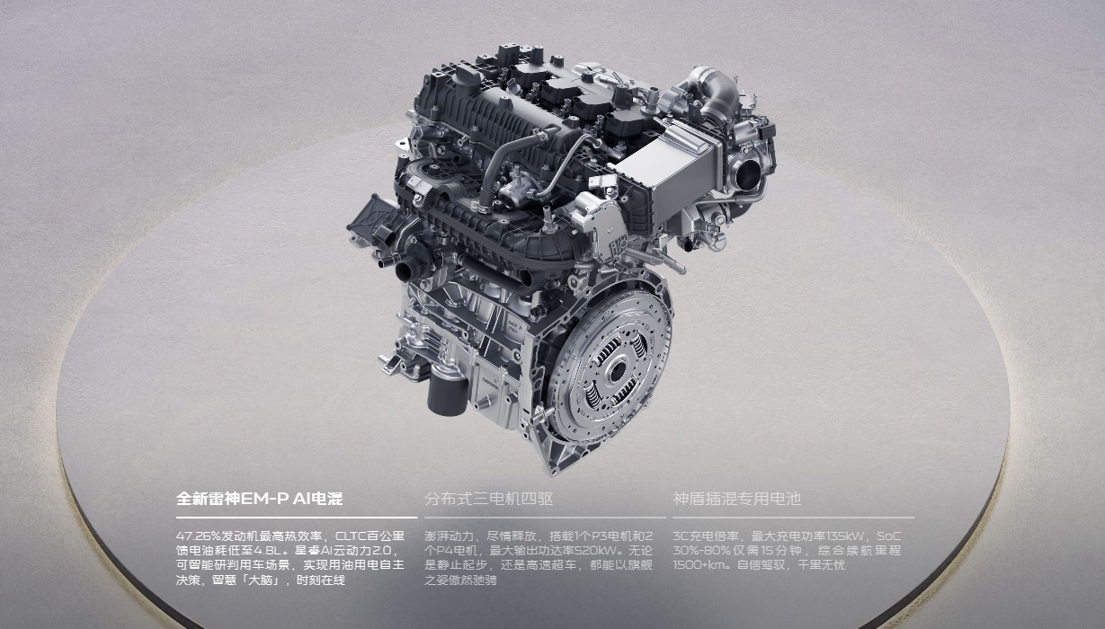 搭载1.5T雷神EM-P混动系统与三电机组合,系统综合功率640kW,峰值扭矩1165N·m,零百加速仅4.5秒,动力堪比性能车。AI云动力2.0大模型能实时感知温度、海拔等路况,智能调节能量策略,CLTC馈电油耗低至4.8L/100km,综合续航超1500km,彻底解决里程焦虑。路特斯调校的AI数字底盘搭配双腔空悬,兼顾操控与舒适,麋鹿测试成绩达83km/h。