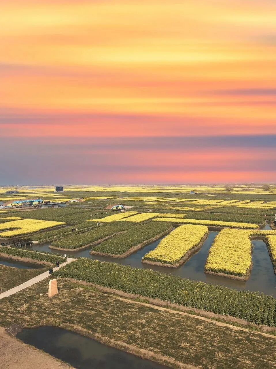 如网的水系将油菜花海巧妙分割,一块块方田如同漂浮在水中的金黄色岛屿,星罗棋布,煞是壮观。