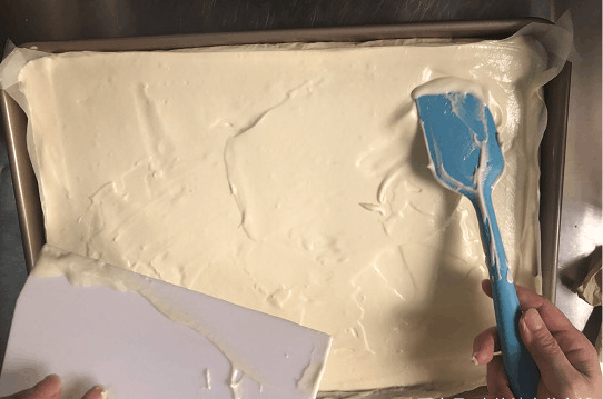 第五步,混合搅拌。将1/3的蛋白糊放入蛋黄液中拌匀,再全部倒回蛋白糊继续搅拌,直到看不到蛋白糊。第六步,放入烤箱。将拌均的蛋糕糊倒入烤盘中,用刮板将其刮平整,再放入预热好的烤箱中。上下火150度,时间根据自己烤箱调节。出炉后倒扣在烤网上,等待蛋糕冷却。