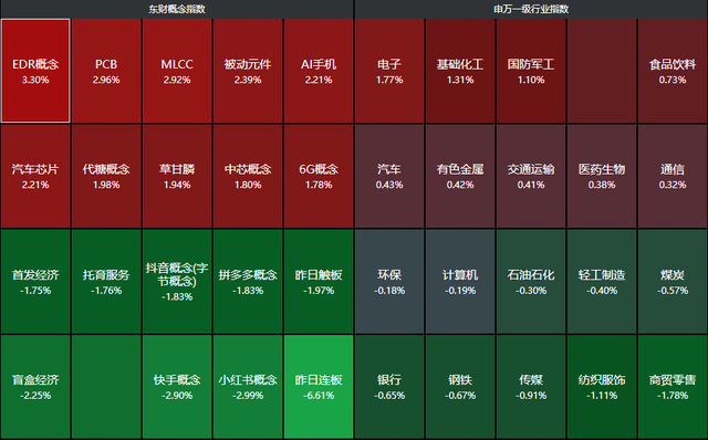 分行业来看,电子、基础化工、国防军工、农林牧渔、食品饮料等行业领涨,商贸零售、纺织服饰、传媒、钢铁、银行等行业领跌。