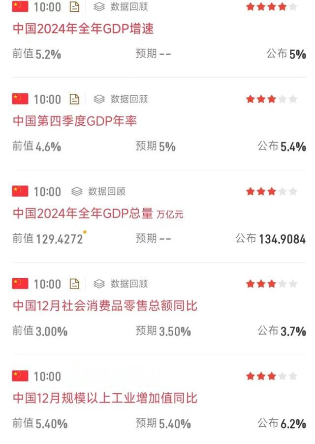 今天统计局公布了4季度GDP数据和12月份经济数据:2024年GDP增速为5%,其中第四季度GDP同比增长5.4%,好于市场预期的5%;12月份社零同比增长3.7%,好于预期的3.5%,规模以上工业增加值同比增长6.2%,大幅好于预期的5.4%。