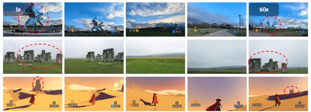 比如在上面这一组三个场景中,静态地标(雕塑、巨石等),即使离开画面后60秒,仍然保持在原位置,没有发生任何改变。