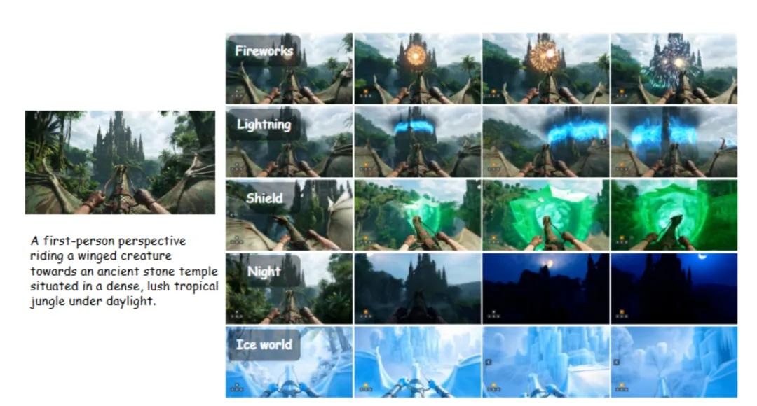比如,仅通过提示词,就能给同一场景更换不同的状态。在下面这个骑龙向城堡飞行的场景中,可以通过提示词,添加烟花、闪电、护盾等特效,也可以改变天气、季节。