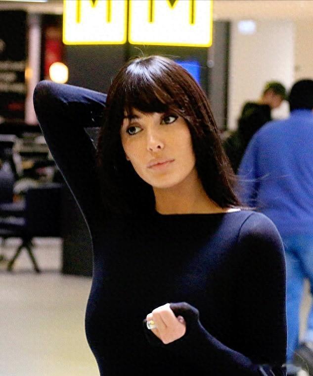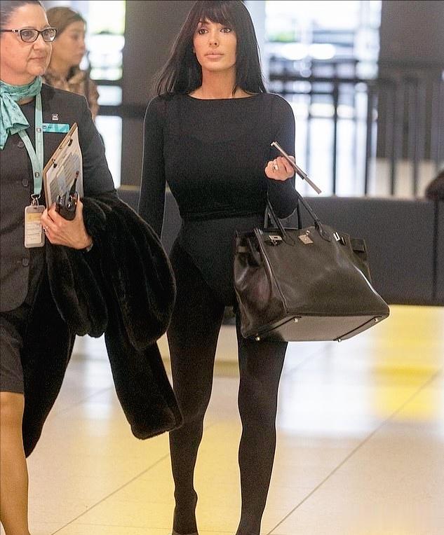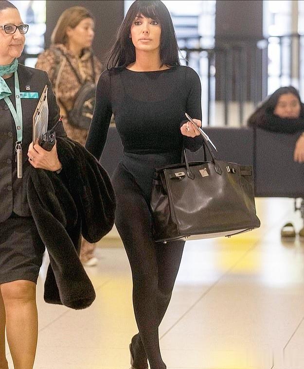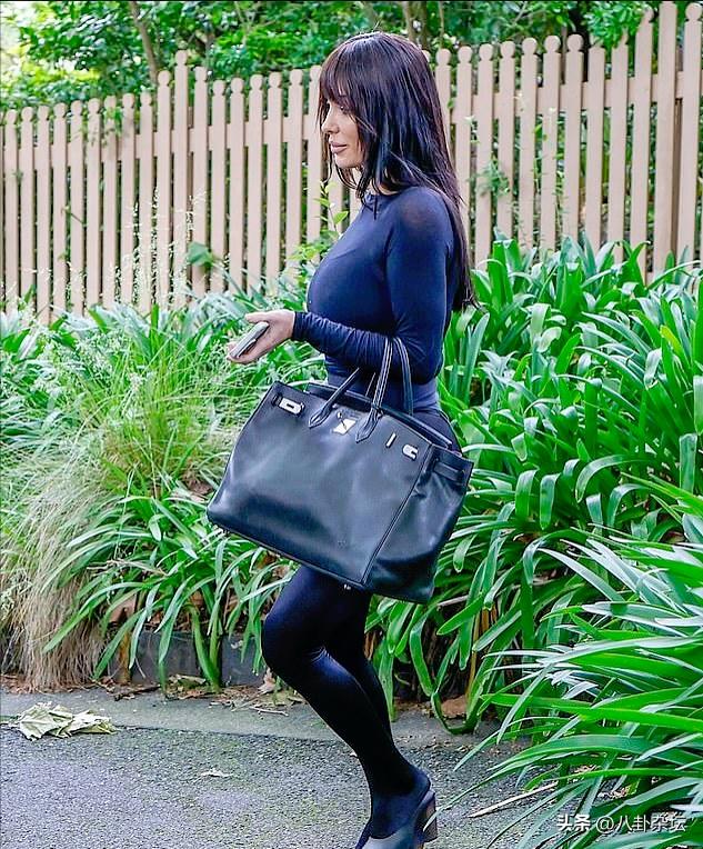 只见她身着一套黑色紧身套装,手挎一款大牌黑色皮包,显得气场十足。上半身穿一件黑色超薄紧身长袖上衣,内搭一件同色系的类似泳衣式的连体丁字裤。