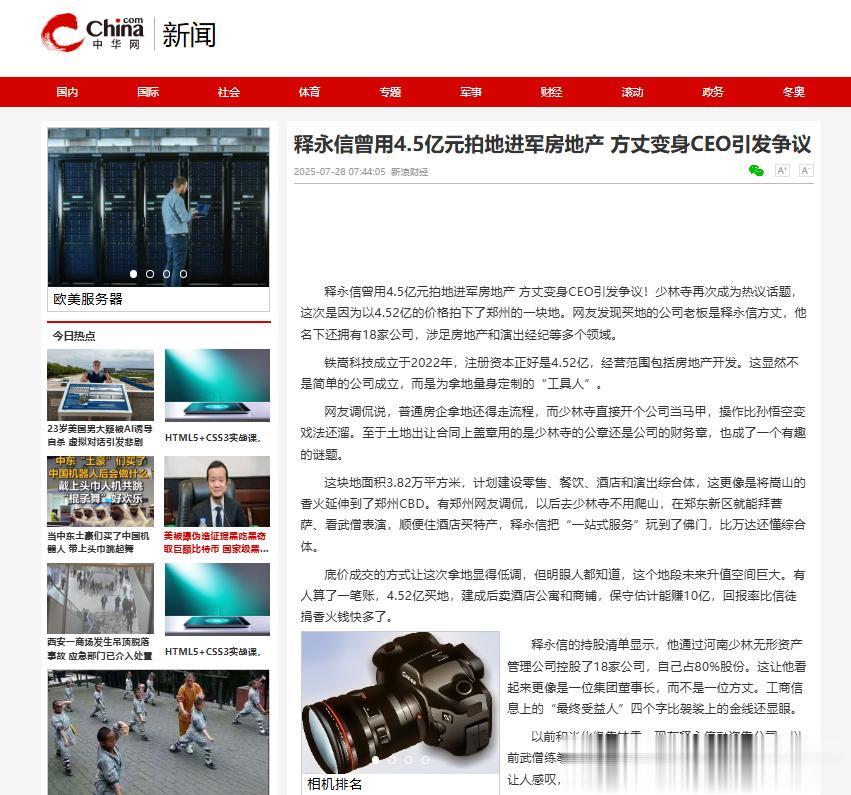 【3】中华网2025-7-28释永信曾用4.5亿元拍地进军房地产,方丈变身CEO引发争议
