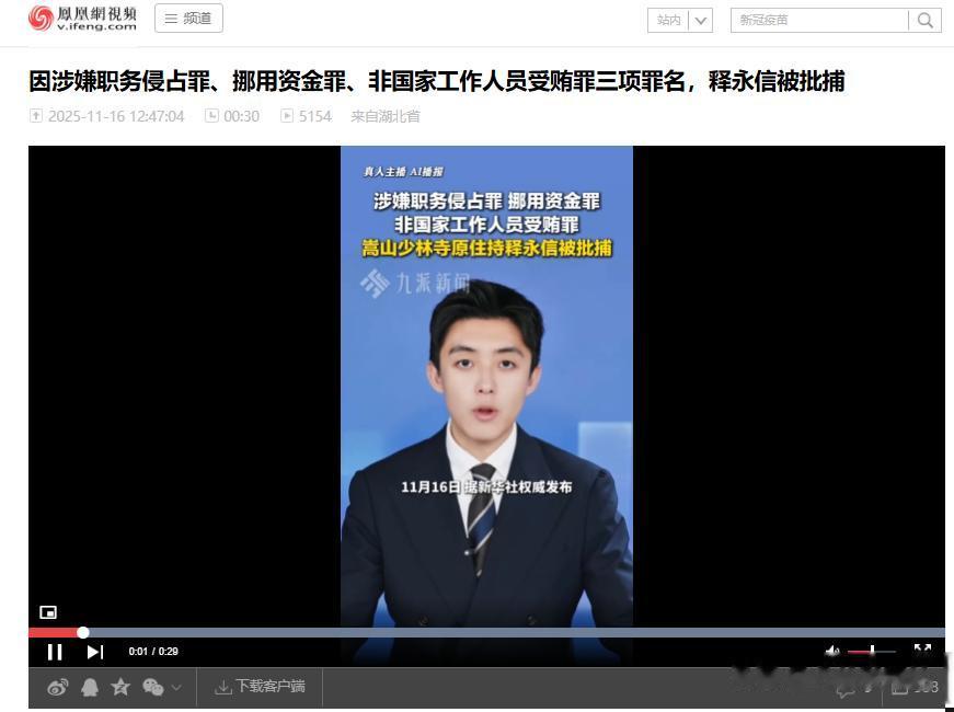 【4】凤凰网2025-11-16因涉嫌职务侵占罪、挪用资金罪、非国家工作人员受贿罪三项罪名,释永信被批捕