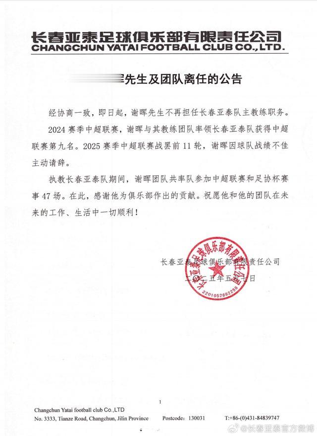 经协商一致,即日起,谢晖先生不再担任长春亚泰队主教练职务。2024赛季中超联赛,谢晖与其教练团队率领长春亚泰队获得中超联赛第九名。2025赛季中超联赛战罢前11轮,谢晖因球队战绩不佳主动请辞。