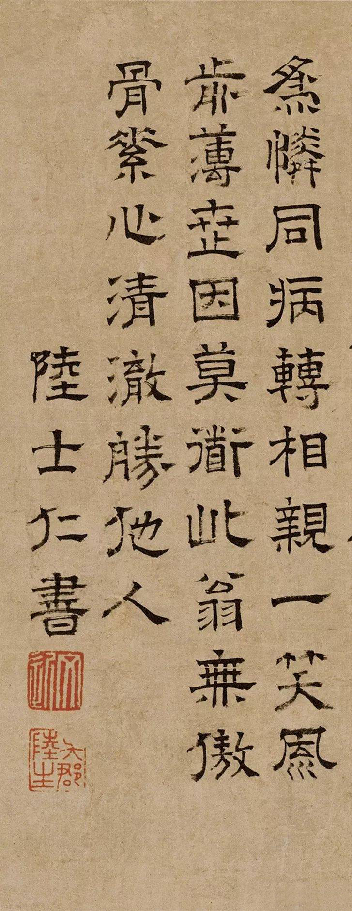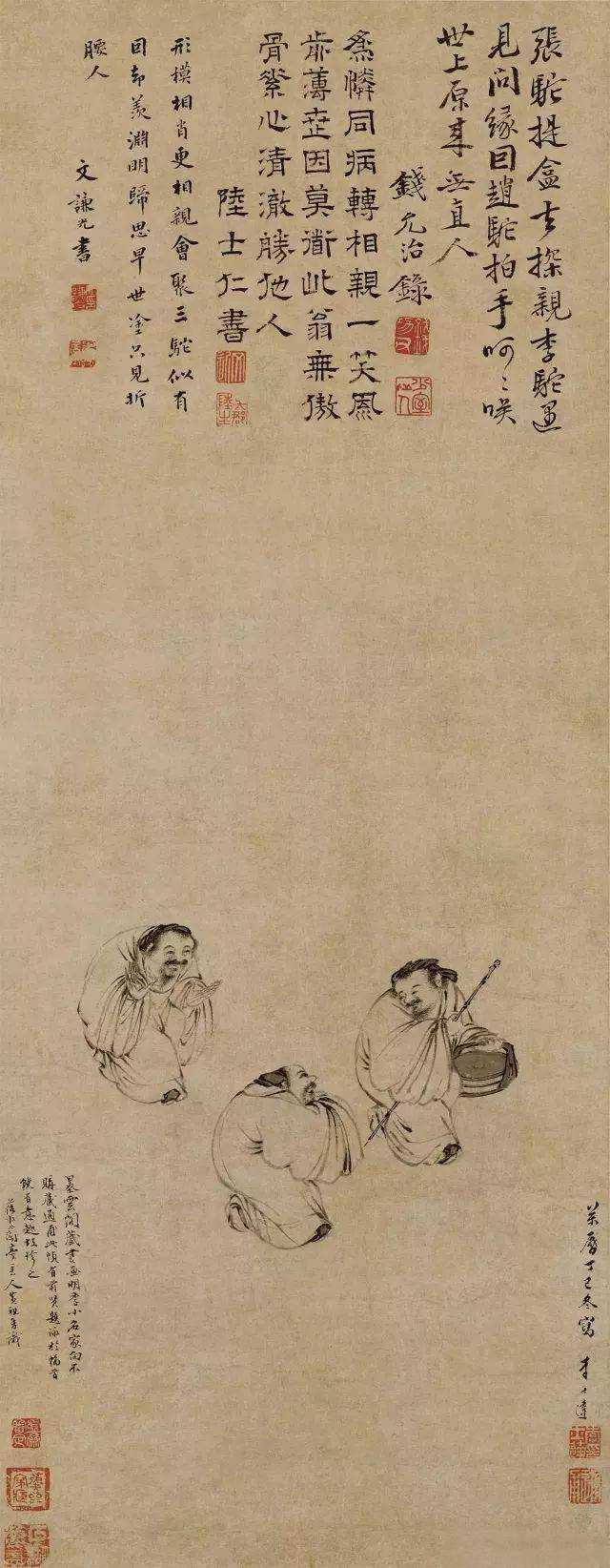 居中是陆士仁的诗,他字文近,苏州人,为文徵明学生陆师道之子,曾补博士弟子员,善画山水。他百花齐放,百家争鸣,敢发“杂音”:驼背仅是生理残疾,但他们的傲骨仍在,其心灵也比“他人”清纯,陆老人家教导我们说,一定要透过现象去寻求本质。他认为驼背人善良正直,较之那些体格健全、却一身软骨的家伙,不可同日而语。