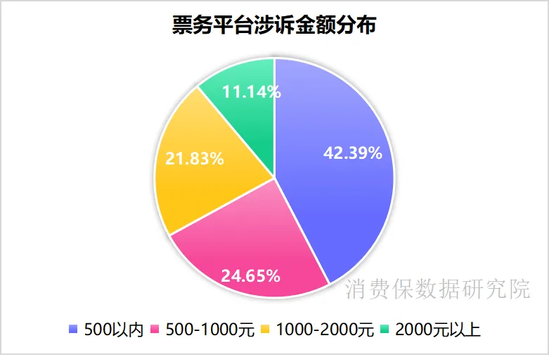 此外,票务平台的涉诉金额分布情况也值得关注。0 - 500 元占 42.39%,500 - 1000 元占 24.65% ,1000 - 2000 元占 21.83% ,2000 元以上高额涉诉也达 11.14% ,反映部分消费者因票务问题承受较大经济损失,行业乱象需重视。