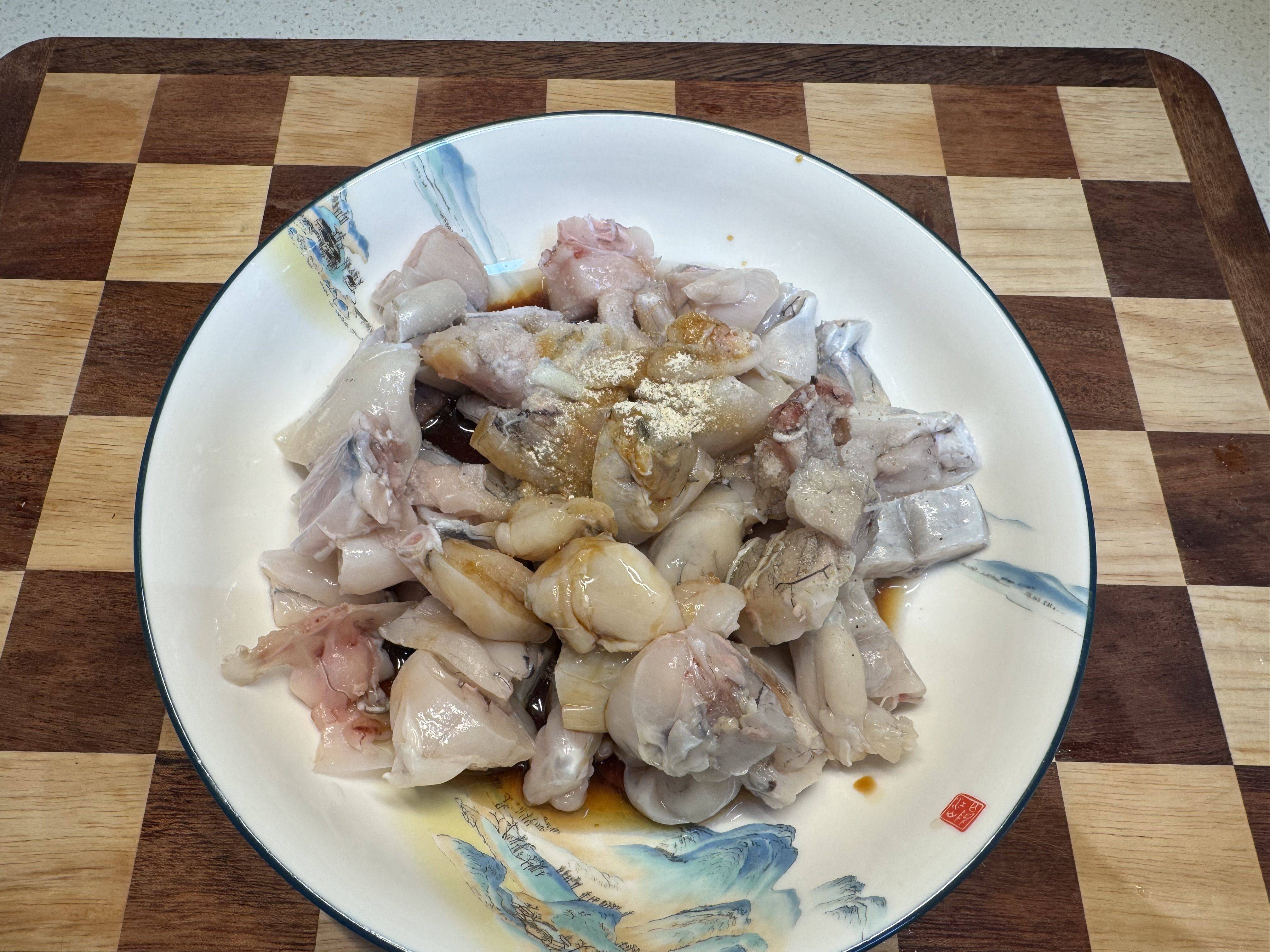 1,牛蛙切成小块,加一勺盐,一勺白胡椒粉,适量生抽,抓匀腌制一会儿,大概十到30分钟吧,家常菜没有太刻板的时间。