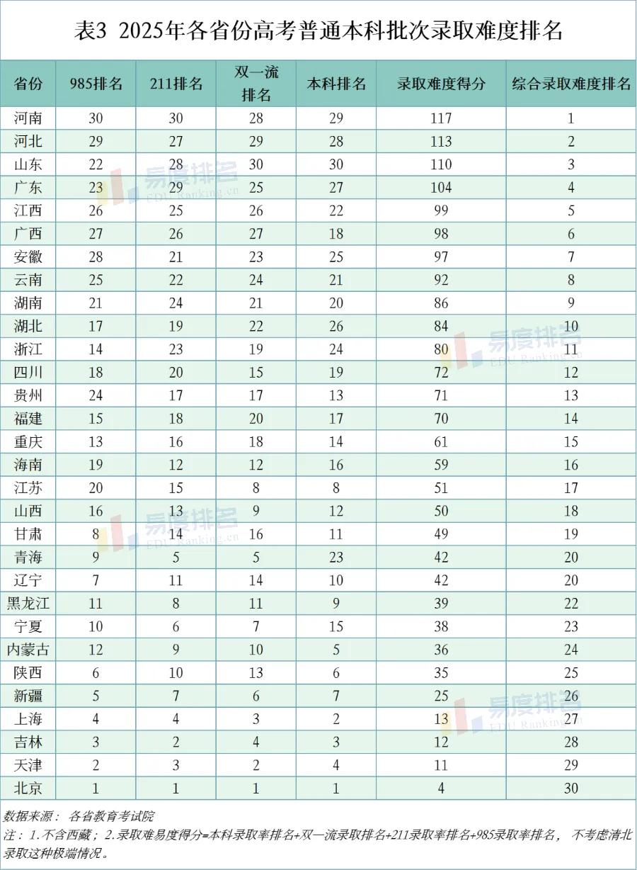 综合难度排名:人口大省的集体困境与京津沪的持续优势表3的综合录取难度排名将各省的高考竞争全景展现无遗。河南以117分的综合难度得分高居榜首,成为2025年高考竞争最激烈的省份。河北、山东、广东紧随其后,形成中国高考的“地狱难度”梯队。