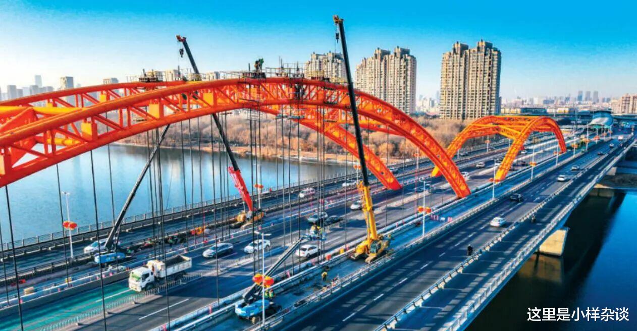 (图片来源于沈阳发布官方公众号)和零公里桥差不多年代的长青桥老桥去年也进行了改造,现在路过还能施工的画面。去年主要对长青桥(老桥)主桥和南、北引桥进行加固改造,主要建设内容包括桥梁结构性维修、耐久性维修以及健康监测改造等,具体为拆除更换全桥吊杆118根、横梁粘贴钢板加固1231㎡、增设纵向钢桁架1600㎡、更换桥面板20476㎡等。