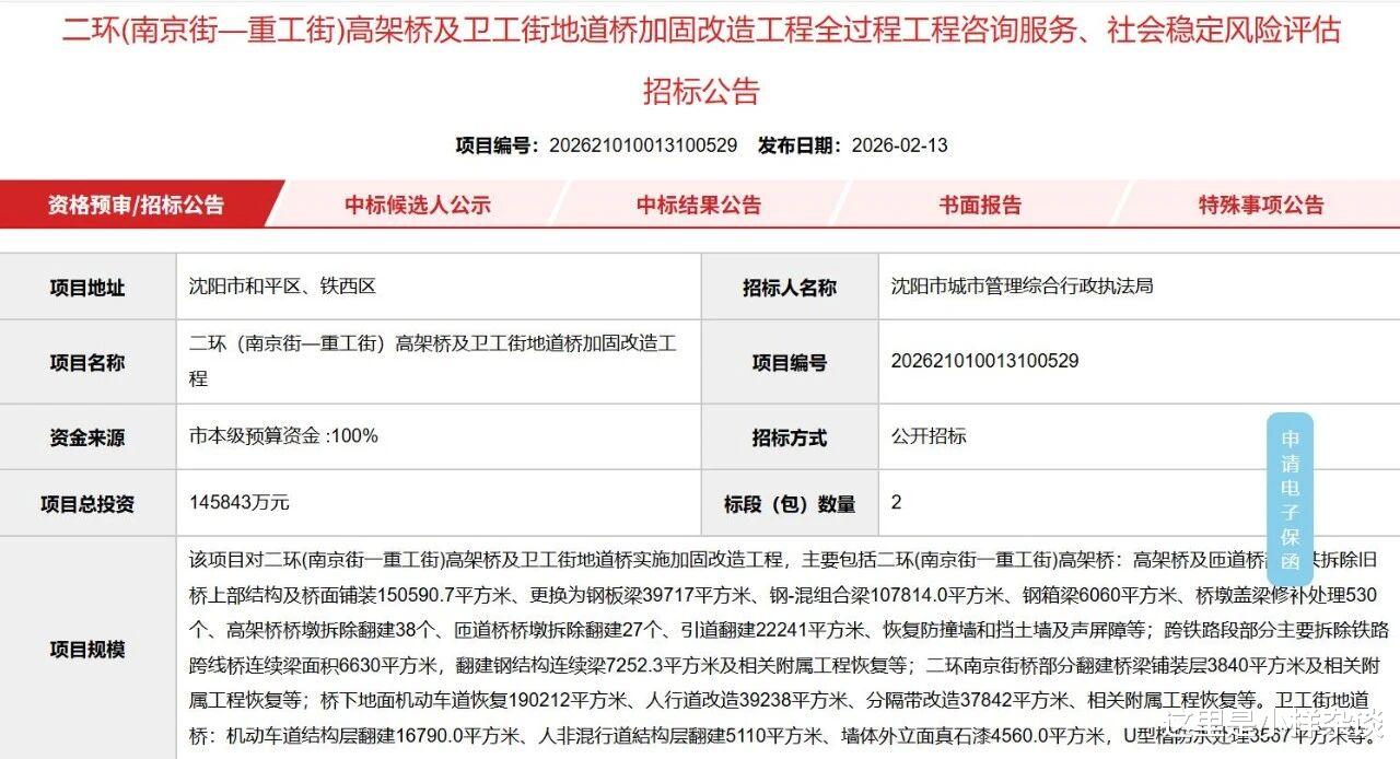 (图片来源于辽宁省招标投标监管网截图)该项目对二环(南京街一重工街)高架桥及卫工街地道桥实施加固改造工程,主要包括二环(南京街一重工街)高架桥:高架桥及匝道桥部分共拆除旧桥上部结构及桥面铺装150590.7平方米、更换为钢板梁39717平方米、钢-混组合梁107814.0平方米、钢箱梁6060平方米、桥墩盖梁修补处理530个、高架桥桥墩拆除翻建38个、匝道桥桥墩拆除翻建27个、引道翻建22241平方米、恢复防撞墙和挡土墙及声屏障等;跨铁路段部分主要拆除铁路跨线桥连续梁面积6630平方米,翻建钢结构连续梁7252.3平方米及相关附属工程恢复等;二环南京街桥部分翻建桥梁铺装层3840平方米及相关附属工程恢复等;桥下地面机动车道恢复190212平方米、人行道改造39238平方米、分隔带改造37842平方米、相关附属工程恢复等。