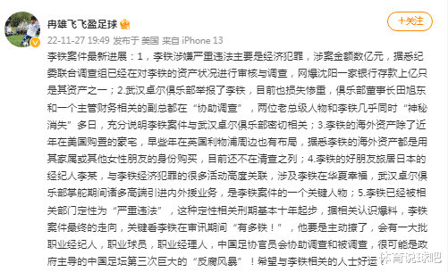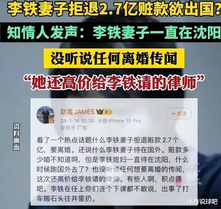 而中国老婆呢?博主赵震发文称,网传李铁的妻子拒退2.7亿,还要离婚?赃款多少不知道,但是李铁媳妇一直待在沈阳,压根没去国外,这次李铁案子的律师都是她高价请的。