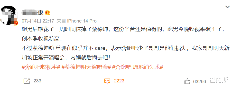 比起网上的乐子人,最关心蔡徐坤的还有他的粉丝们,在节目开播前粉丝已经有了两套说辞,一套是蔡徐坤没有被删那么就会夸赞节目慧眼识珠,一套是看到蔡徐坤被消失处理后,声称如果没有蔡徐坤参加,就没人看节目,还说蔡徐坤在15号正常举办演唱会,内娱损失蔡徐坤后悔去吧!