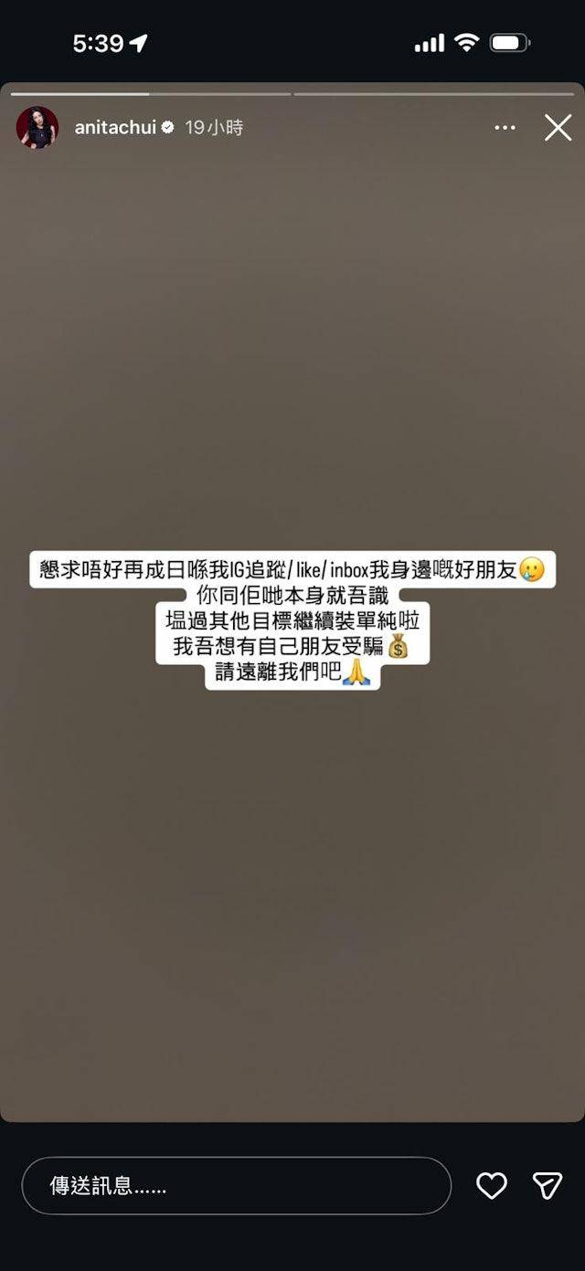 谁知道之后剧情峰回路转,崔碧珈在社交平台上发文,疑似炮轰有人是在装单纯,并且把目标对准了自己身边的朋友,崔碧珈更发文表示希望对方可以远离他们,在这件事之后,二人的关系可以说是正式决裂。