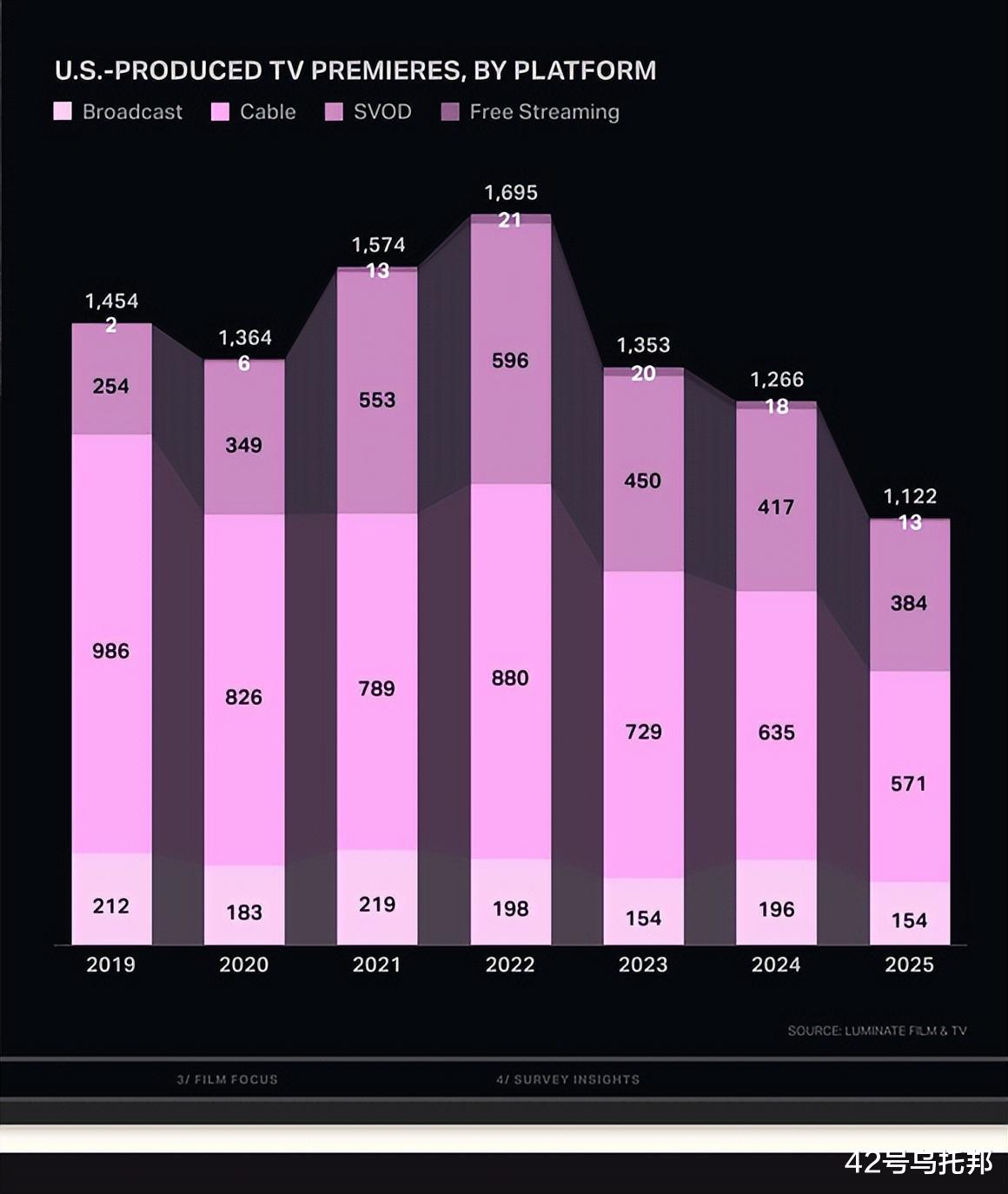 自2022年达到高峰以来,2025年电视台和流媒体平台播出的剧集数量连续第三年下降。根据数据公司Luminate的年终报告,去年首播的节目数量为1122部,比2024年的1266部下降了11%。Luminate的数据显示,自2022年达到1695部节目的峰值以来,电视节目(不包括体育直播和新闻节目)的总量已经缩减了三分之一。