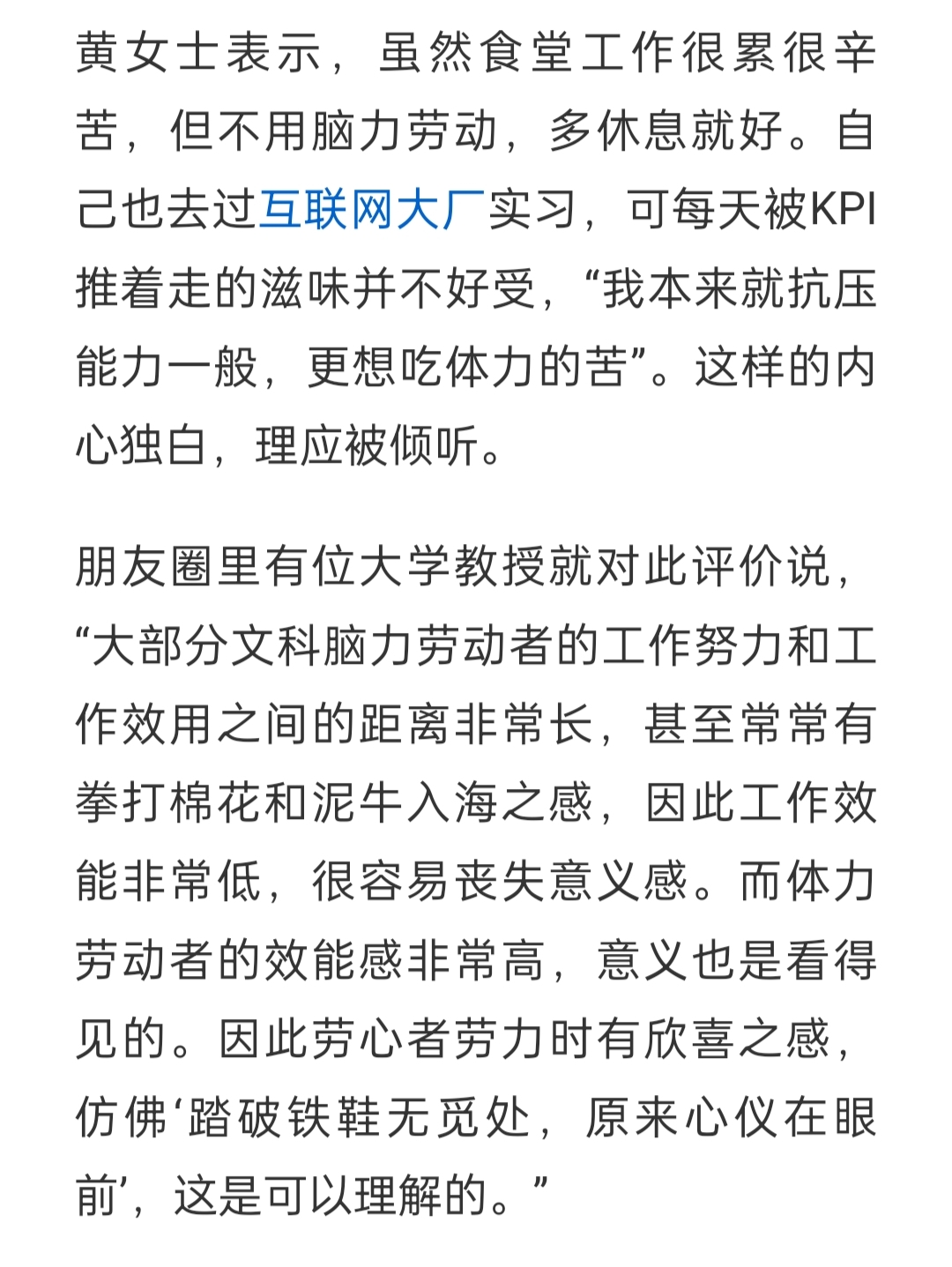 对此,这位黄女士进行了回应,虽然食堂工作很累很辛苦,但不用脑力劳动劳动,多休息就好,自己也去过互联网大厂实习,可每天被KPI推着走的滋味并不好受,抗压能力一般,更想吃体力的苦,真的是我这辈子最最快乐的工作。