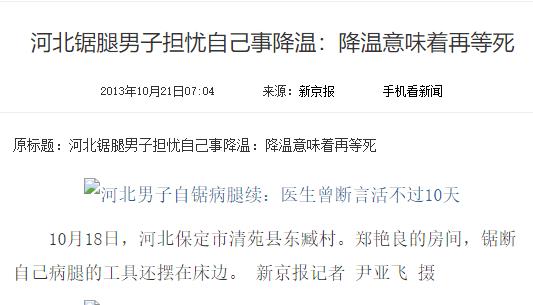 新京报2013年10月21日《河北锯腿男子担忧自己事降温:降温意味着再等死》的报道